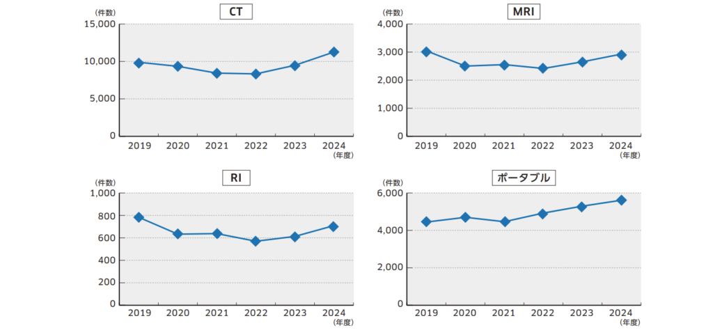 実績としては、全体的な稼働状況は、比較的活況で、特にCT検査においては、枠外検査が月平均59%以上を占めた。CT検査は、日常診療に不可欠なものとなり、件数も新型コロナ拡大以前の数字を上回る総数となった。また、MRI検査、核医学検査についても、2019年度に及ばないものの、地域の先生方からのご紹介が大幅に増加していて、MRI検査は総数の33%、核医学検査は57%が紹介での検査であった。