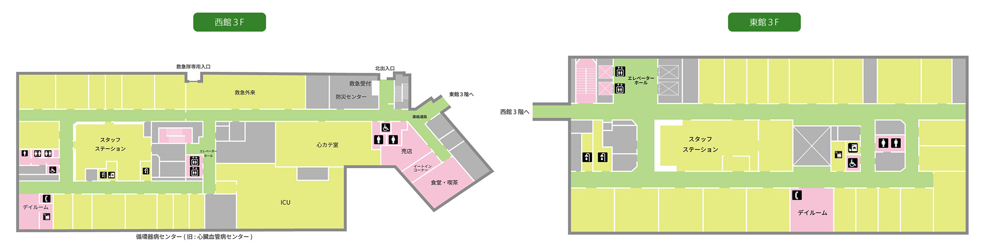 - 西館の5階以上へ上がられる方は、連絡通路で西館へ移動してからお上がりください。