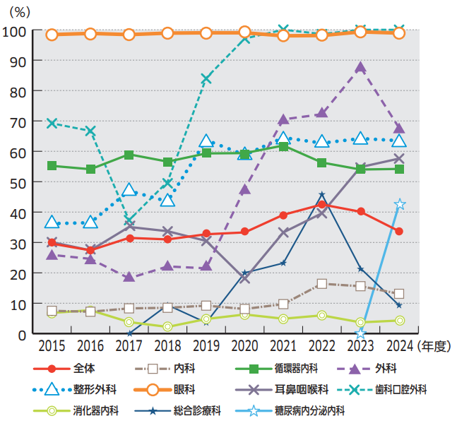 2015~2024年度のクリニカルパス適用率を図1に示す。クリニカルパスの作成や改訂が思うように進まず、適用率は33.7%と低下傾向にある。2024年度よりDPC分析システムgirasolを用いたクリニカルパス分析や他施設とのベンチマークにより、DPC期間Ⅱを意識したクリニカルパス改訂を開始したところであるが、次年度はバリアンス分析に基づいた改訂と入院患者数の多い疾患を中心に作成作業を進め、適用率のアップを目指す。