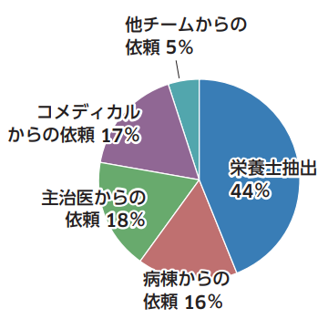 当チームの主な活動は、毎週水曜日のNST回診の実施と月1回のNSTチーム会の開催である。