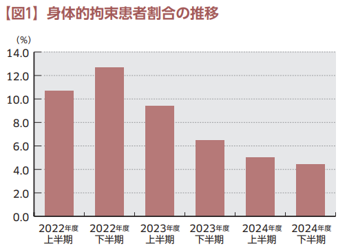 当チームは、医療を受ける対象者が自由であるほどQOLは向上するという前提のもと、人間としての本来の姿を重視しながら医療安全対策を考え、身体的拘束をせざるを得ない状況について検討するために設置された。思考停止に陥らず、悩みながら、漫然と身体的拘束を続けることがないよう取り組み、倫理的な組織文化を醸成していくことを役割としている。5月から設置準備を始め、マニュアルや回診等の整備を行ったところ、身体的拘束割合の減少がみられた(図1)。