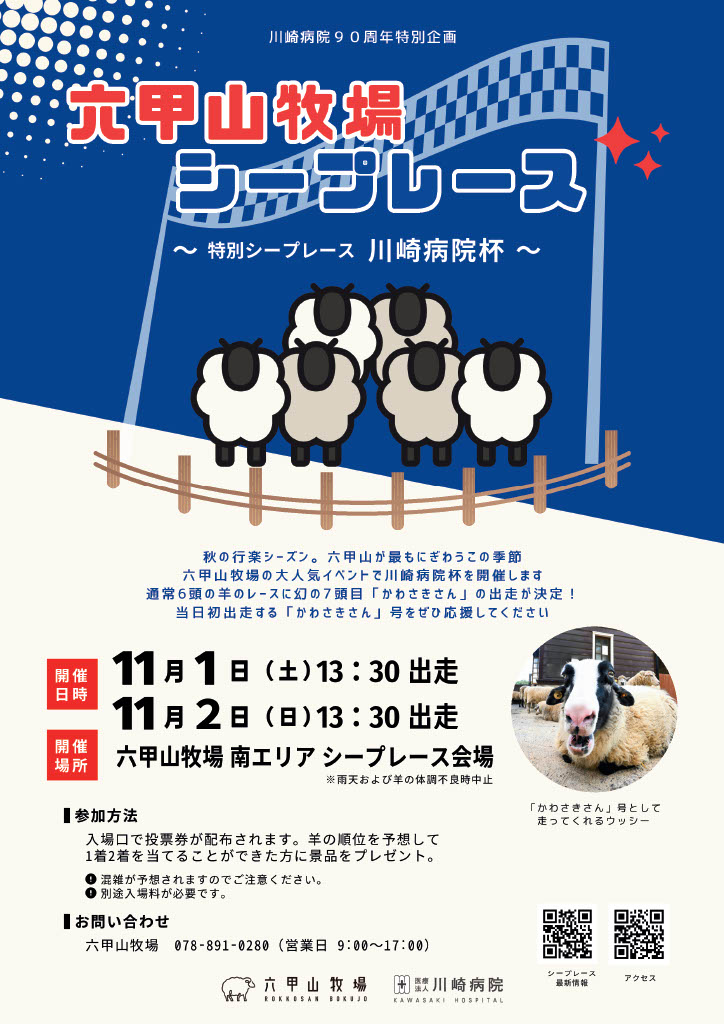 秋の行楽シーズン。六甲山に最もひとが訪れるこの時期に川崎病院は開設90周年を記念して、六甲山牧場で大人気イベントのシープレースで川崎病院杯を実施いたします。