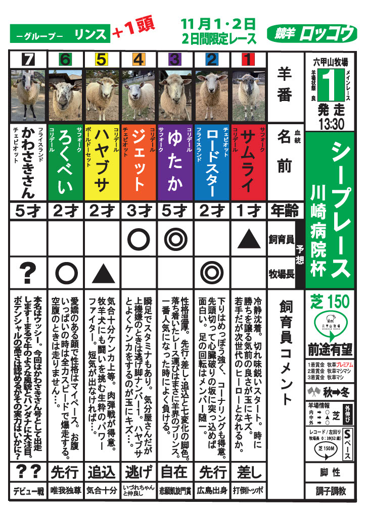 六甲山牧場でのシープレースは、通常6頭の羊が出走しますが、なんと特別に幻の7頭目を走らせていただくこととなりました。7頭目の羊の名前は「かわさきさん」(本名はウッシー)。ひと目見たら忘れられないまるで牛のような風貌の羊です。通常はレースに参加していない羊ですので、当日どんな走りを見せてくれるのか乞うご期待です。