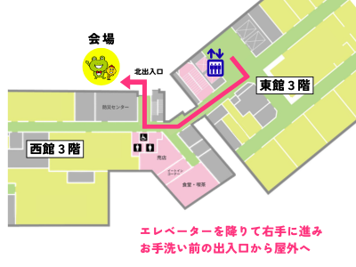 - 売店のそばにある北出入口から屋外へ出て、左手が会場です